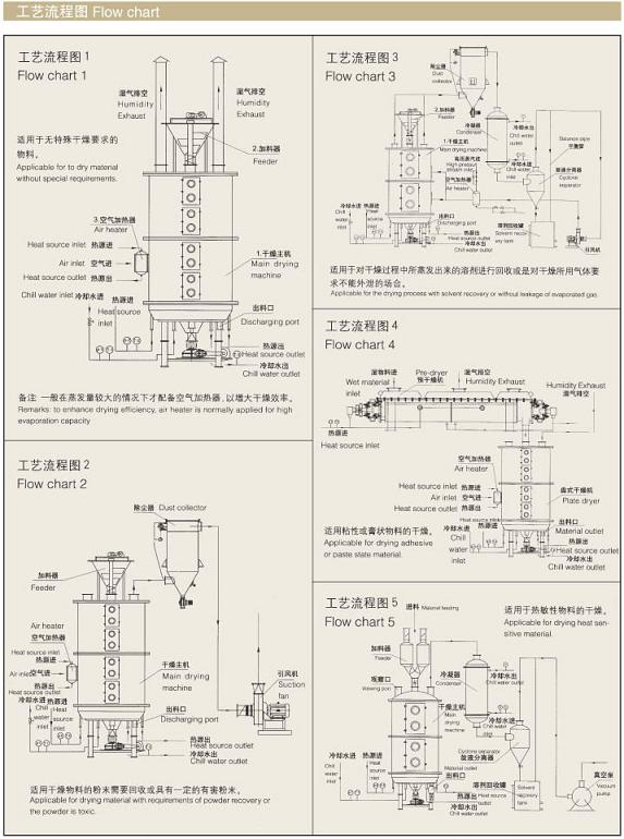 原理 : 濕物料自加料器連續(xù)地加到干燥器上部第一層干燥盤上,帶有耙葉的耙臂作回轉(zhuǎn)運(yùn)動使耙臂作回轉(zhuǎn)運(yùn)動使耙葉連續(xù)地翻抄物料。物料沿指數(shù)螺旋線流過干燥盤表面,在小干燥盤上的物料被移送到外緣,并在外緣落到下方的大干燥盤外緣,在大干燥盤上物料向里移動并從中間落料口落入下一層小干燥盤中。大小干燥盤上下交替排列,物料得以連續(xù)地通過整個干燥器。中空的干燥盤內(nèi)通入加熱介質(zhì),加熱介質(zhì)形式只有熱水和導(dǎo)熱油,加熱介質(zhì)由干燥盤的一端進(jìn)入,從另一端導(dǎo)出。已干燥物料從最后一層干燥盤落到殼體的底層,最后被耙葉移送到出料口排出,真空型盤式干燥器的濕氣由設(shè)在頂蓋上的真空泵口抽出。從底層排出的干物料可直接包裝。通過配加翅片加熱器、溶劑回收冷凝器、袋式除塵器、干料返混機(jī)構(gòu)、引風(fēng)機(jī)等輔機(jī),可提高其干燥的生產(chǎn)能力,干燥膏糊狀和熱敏性物料,可方便地回收溶劑,并能進(jìn)行熱解和反應(yīng)操作。